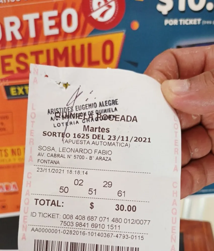Su golpe de suerte estuvo dado por una apuesta automática, con los números 02, 29, 50, 51 y 61. "Fue algo muy loco, porque siempre juego tres boletas fijas. Ese día fui a hacer las tres jugadas de siempre y cuando me estaba yendo, di la vuelta en la puerta y le pedí al subagenciero que me hiciera tres más, automáticas", reveló el feliz ganador.