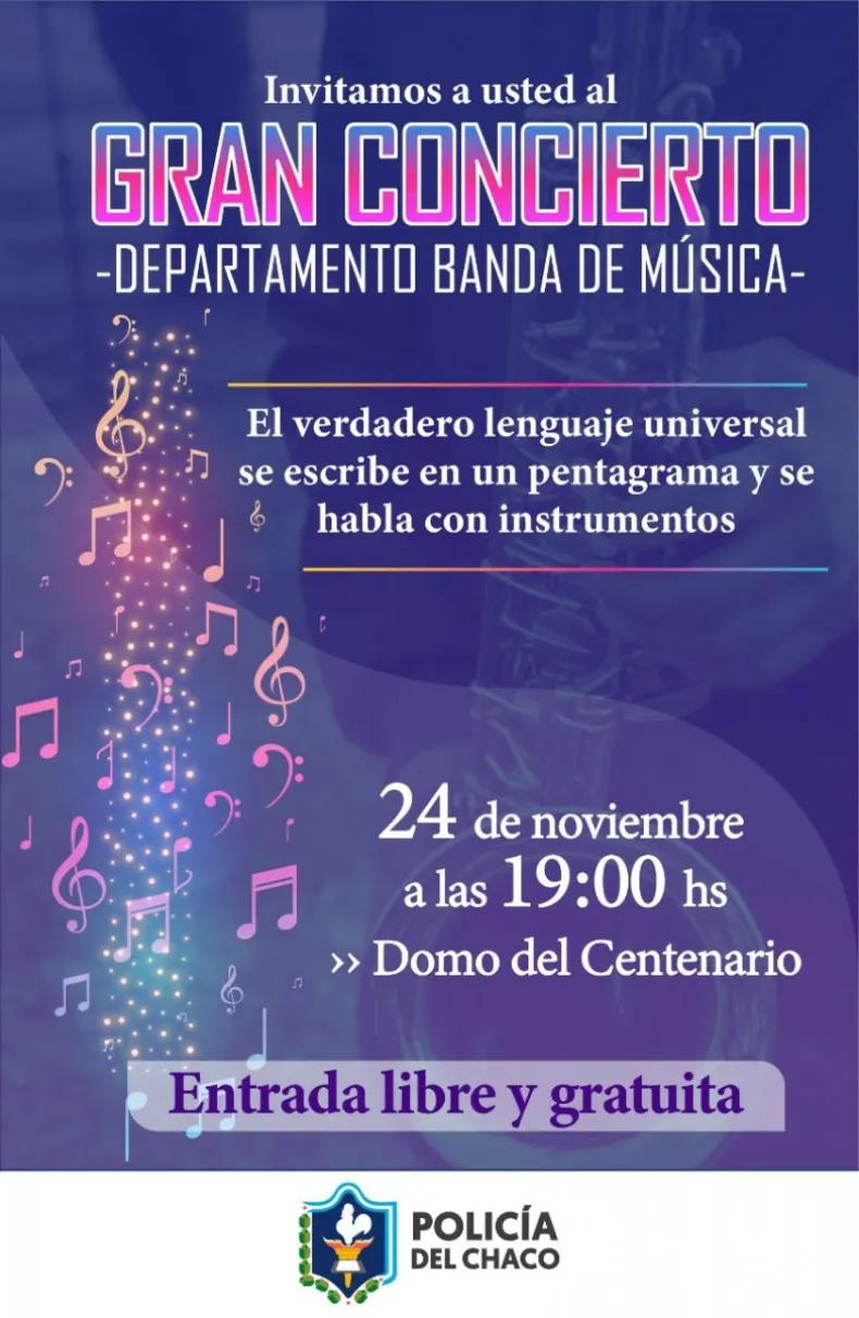 Este miércoles 24 a las 19 horas, en el Domo del Centenario, se realizará un Gran Concierto a cargo del Departamento de la Banda de Música de la Policía del Chaco. La entrada es libre y gratuita.