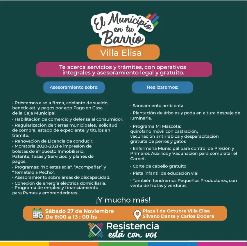 De 8 a 13 horas, el municipio de Resistencia realizará este sábado "El Municipio en tu Barrio" en Villa Elisa, más precisamente en la Plaza 1° de Octubre, ubicada en la intersección de las calles Silvano Dante y Carlos Dodero. Este programa municipal acerca servicios y trámites, operativos integrales y asesoramiento gratuito a diferentes vecindarios de la ciudad.