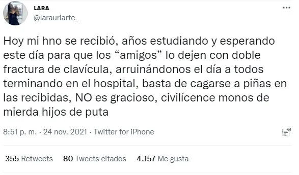 "Hoy mi hermano se recibió, años estudiando y esperando este día para que los "amigos" lo dejen con doble fractura de clavícula, arruinándonos el día a todos terminando en el hospital, basta de cagarse a piñas en las recibidas, NO es gracioso, civilícense", fueron las palabras de la joven que expresó su molestia y despertó miles de respuestas adhiriendo a los cuestionamientos a dichas formas de celebración.