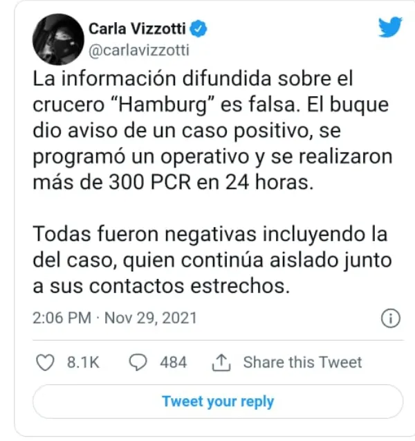"La información difundida sobre el crucero "Hamburg" es falsa. El buque dio aviso de un caso positivo, se programó un operativo y se realizaron más de 300 PCR en 24 horas. Todas fueron negativas incluyendo la del caso, quien continúa aislado junto a sus contactos estrechos", aclaró en Twitter la ministra de Salud, Carla Vizzotti. Así salió al cruce de la versión de que la Dirección de Sanidad de Fronteras había habilitado este viernes el ingreso sin control de un crucero procedente de Cabo Verde, África, creyendo que se trataba de un país asiático.