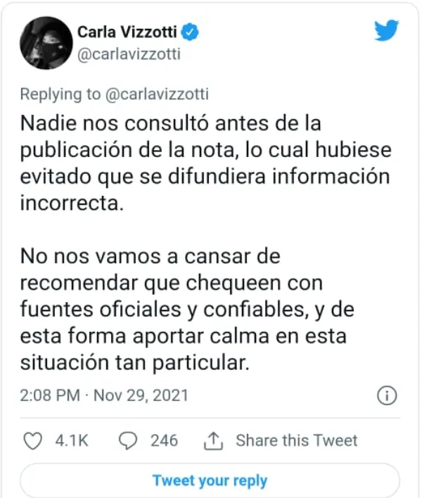 Al desmentir que no se hayan aplicado los controles del caso, Vizzotti remarcó que "nadie nos consultó antes de la publicación de la nota, lo cual hubiese evitado que se difundiera información incorrecta". El caso del supuesto error de las autoridades sanitarias fue dado a conocer por Infobae. La ministra agregó: "No nos vamos a cansar de recomendar que chequeen con fuentes oficiales y confiables, y de esta forma aportar calma en esta situación tan particular".
