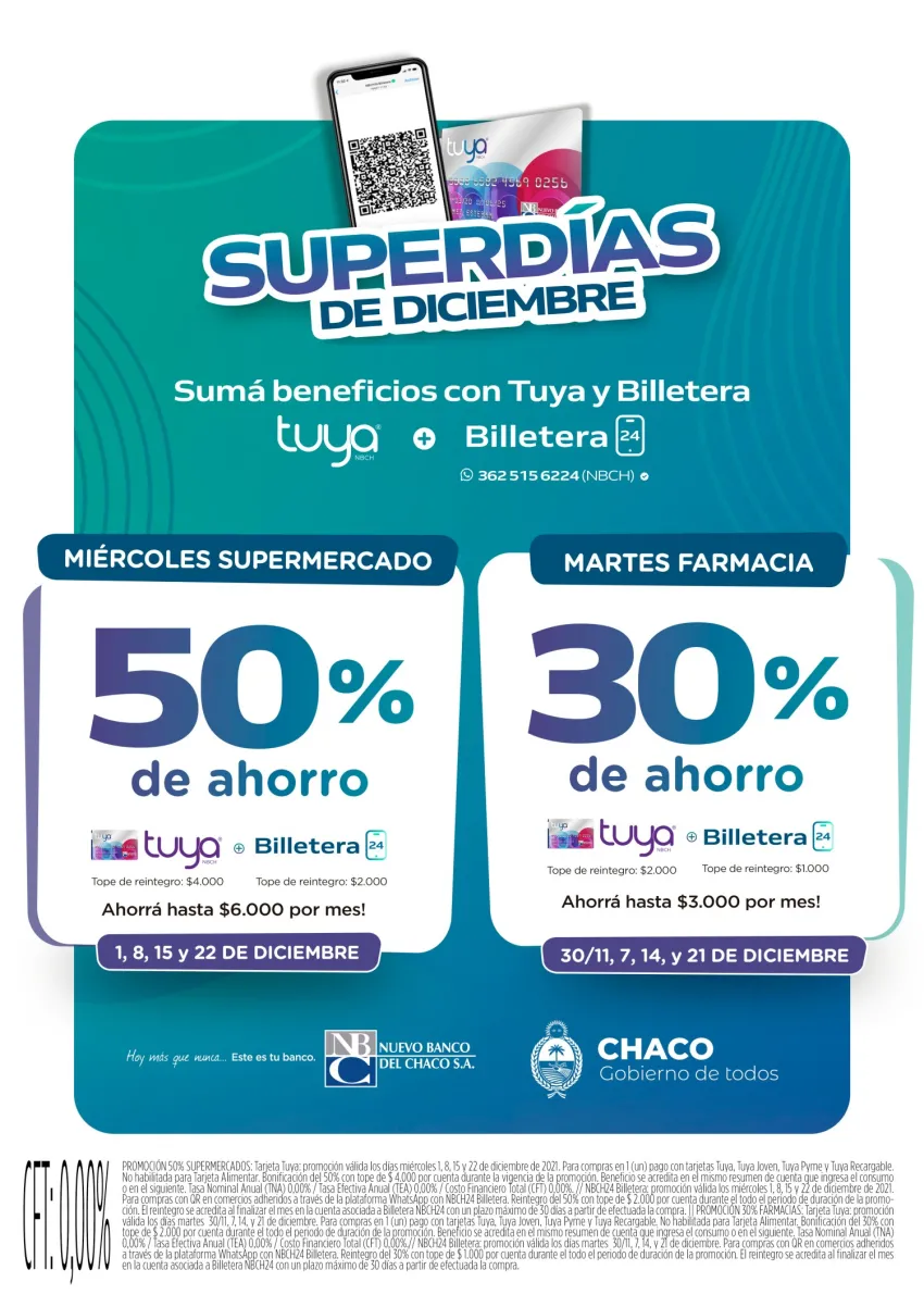 La promoción Superdías, de Nuevo Banco del Chaco con el Gobierno Provincial, estará vigente desde el martes 30 de noviembre hasta el miércoles 22 de diciembre con descuentos para las compras con Tuya y Billetera NBCH24.