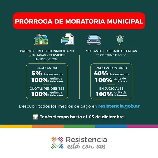 El municipio de Resistencia extendió hasta el 3 de diciembre el plazo de vencimiento del Plan de Facilidades de pago de tributos municipales adeudados de los ejercicios 2020 y 2021. Esta moratoria incluye multas contravencionales desde el año 2016 en adelante. En todos los casos habrá beneficios importantes en concepto de descuentos.