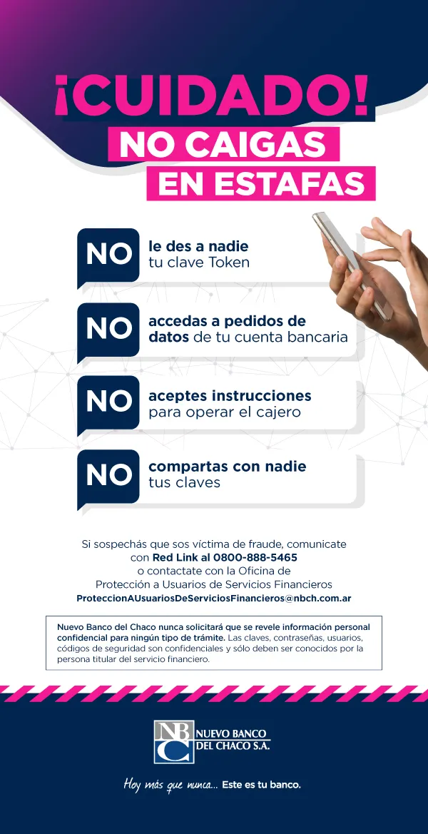 Desde el Nuevo Banco del Chaco advierten a los usuarios para que no caigan en estafas, y recomiendan no brindar la clave token a nadie, no acceder a pedidos de datos de la cuenta bancaria, no aceptar instrucciones para operar el cajero y no compartir con nadie las claves.