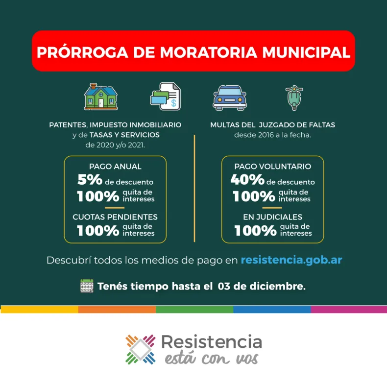 Los vecinos y vecinas podrán acogerse hasta este viernes 3 de diciembre al Plan de Facilidades de pago que impulsa la Municipalidad de Resistencia para los tributos municipales adeudados de los ejercicios 2020 y 2021. Este régimen con importantes descuentos, incluye multas contravencionales desde el año 2016 en adelante.
