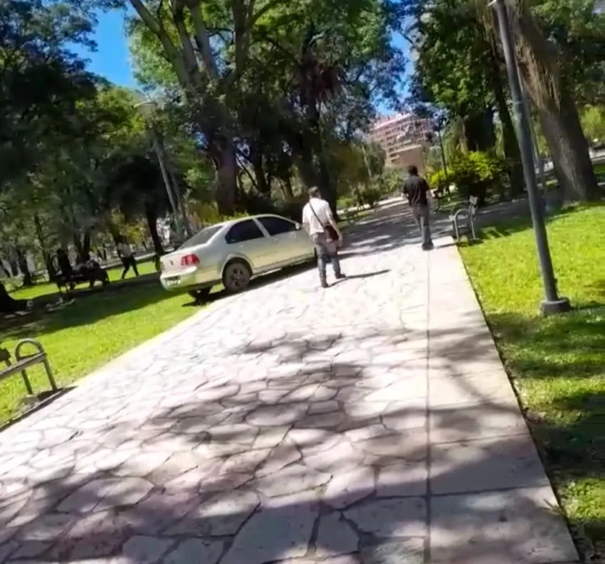 Buscan al conductor que subió con su auto a la plaza para sancionarlo por "conducción peligrosa"
