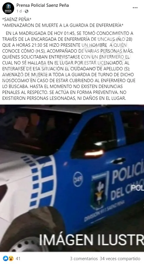 Un episodio de violencia en la clínica de la Uncaus en Sáenz Peña ocurrió el miércoles por la madrugada. Según el primer informe policial, alrededor de las 23.30 se presentó un hombre, acompañado por otros 3, buscando a un enfermero, al no encontrarlo amenazó de muerte a todos los que estaban presentes.