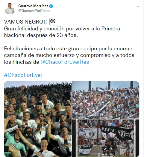 Del mismo modo lo hizo el intendente de Resistencia, Gustavo Martínez, quien escribió en su cuenta de Twitter: "Vamos Negro" y agregó "Gran felicidad y emoción por volver a la Primera Nacional después de 23 años".
