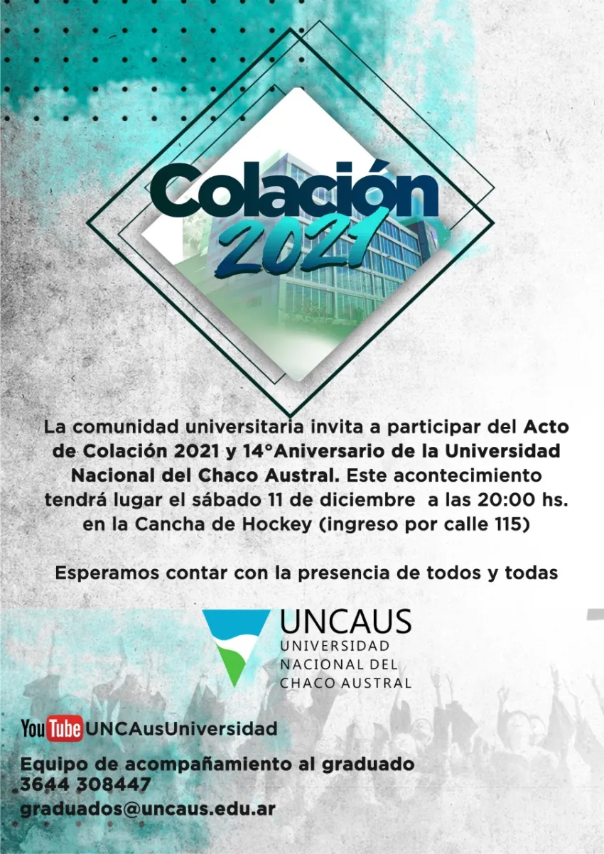 La Universidad Nacional del Chaco Austral celebrará el día sábado 11 de diciembre, a las 20 horas en la cancha de Hockey, el Acto de Colación del año 2021 y el 14° Aniversario de su creación.