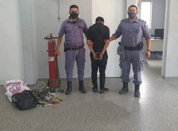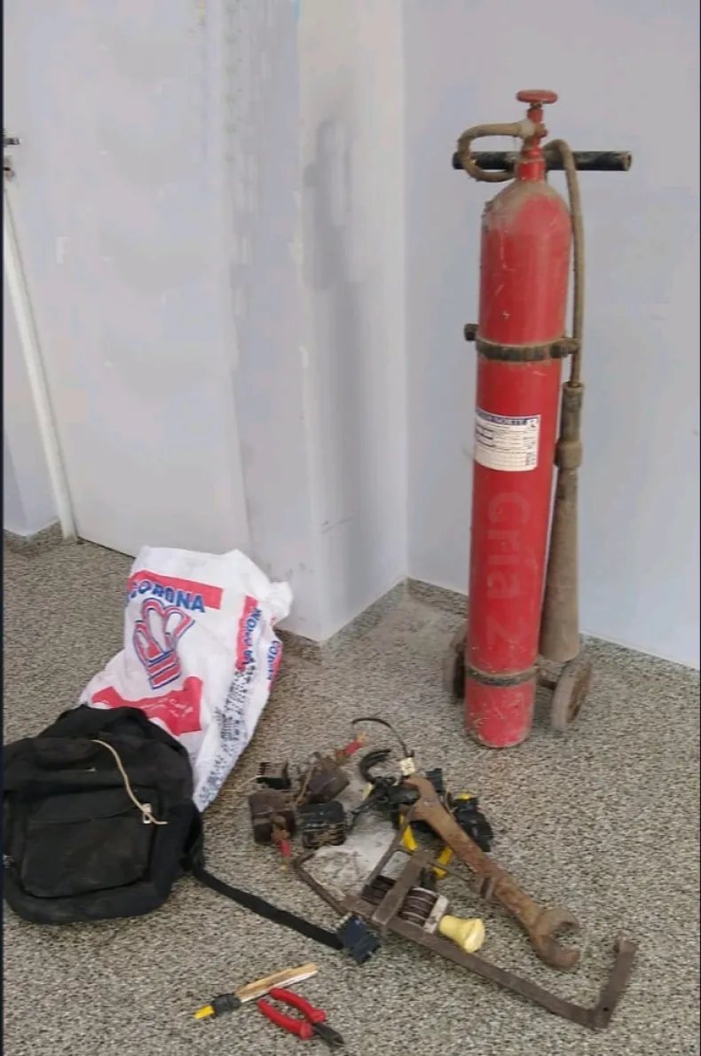 Al momento de su detención, el ladrón trasladaba un matafuego color rojo de 10 kilogramos apto para usar en electricidad, con su respectivo transporte de hierro, también llevaba una mochila, y una bolsa arpillera que contenía en su interior una llave de hierro, una prensa de hierro, dos pinzas, un cuchillo prefabricado con hoja de sierra de unos 5 centímetros, una llave de hierro tipo "L", y varias cajas de luz y térmicas.