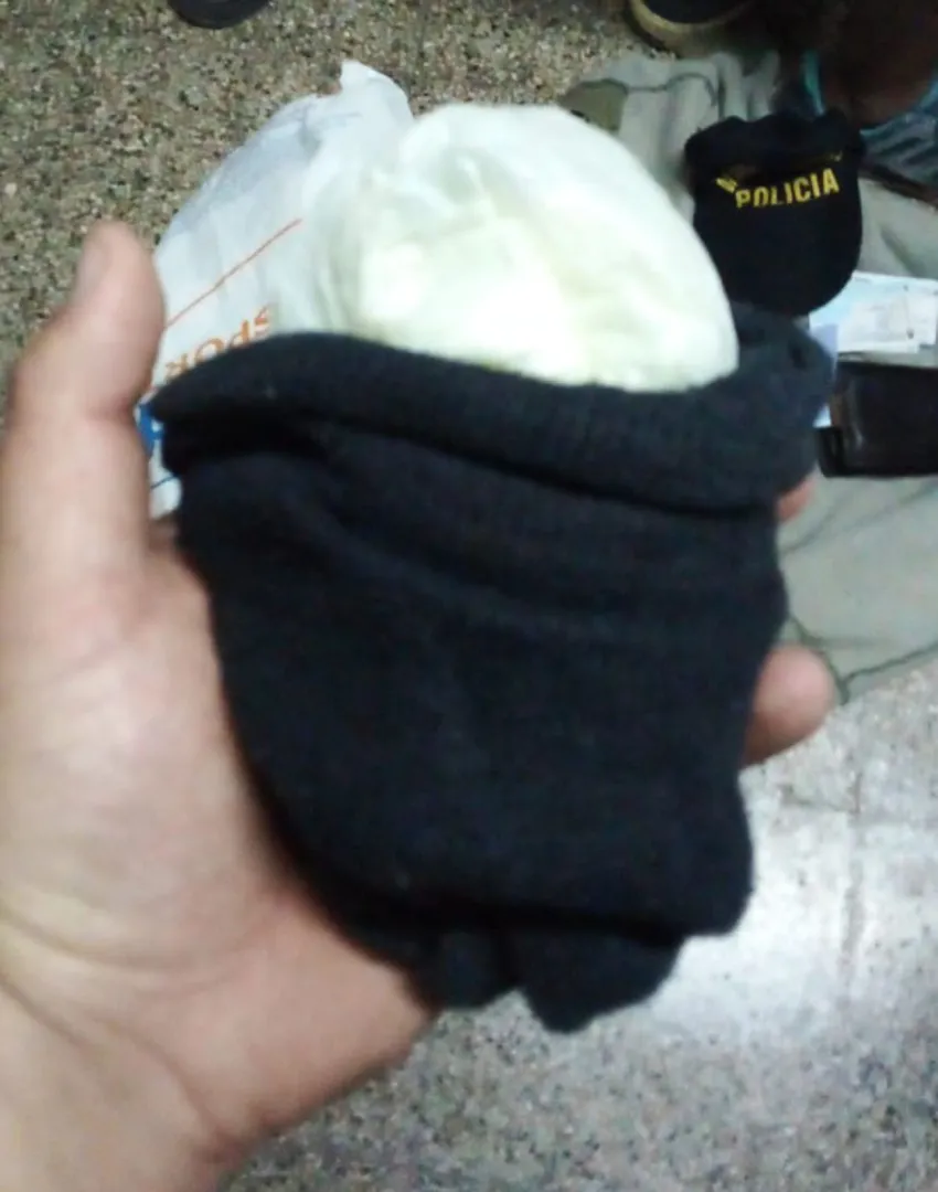 Tras atraparlo lo llevaron hasta el lugar donde abandonó sus pertenencias para la inspección correspondiente y se halló, dentro de una media, un envoltorio con sustancia blanquecina. Luego de realizar la prueba de campo con reactivos químicos sobre la sustancia, ésta resultó ser cocaína con el peso de 165 gramos.