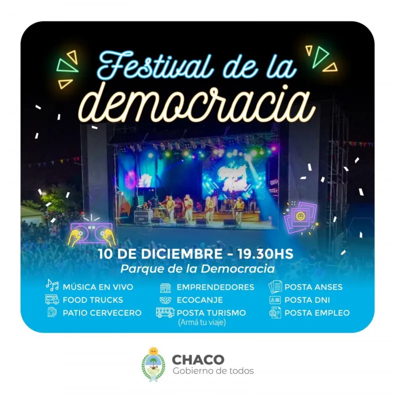 Este viernes desde las 19 horas se realizará el Festival de la Democracia en el Parque de la Democracia de Resistencia, y el Gobierno Provincial invita a la ciudadanía a sumarse a la iniciativa. Habrá feria de emprendedores, foodtrucks, patio cervecero, artistas locales, shows en vivo y posta de ANSES, DNI, Turismo, Ecocanje y de difusión de políticas públicas que buscan garantizar los derechos humanos de la ciudadanía.