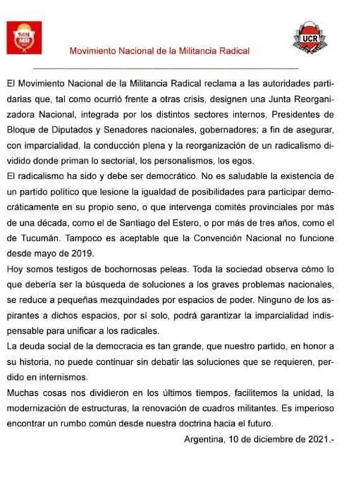 A raíz de los últimos cruces internos dentro del radicalismo, el Movimiento Nacional de la Militancia Radical reclamó a las autoridades partidarias que "designen una junta Reorganizadora nacional, integrada por los distintos sectores internos. Presidentes de Bloque de Diputados y Senadores nacionales, gobernadores; a fin de asegurar, con imparcialidad, la conducción plena y la reorganización de un radicalismo dividido donde prima lo sectorial, los personalismos, los egos".