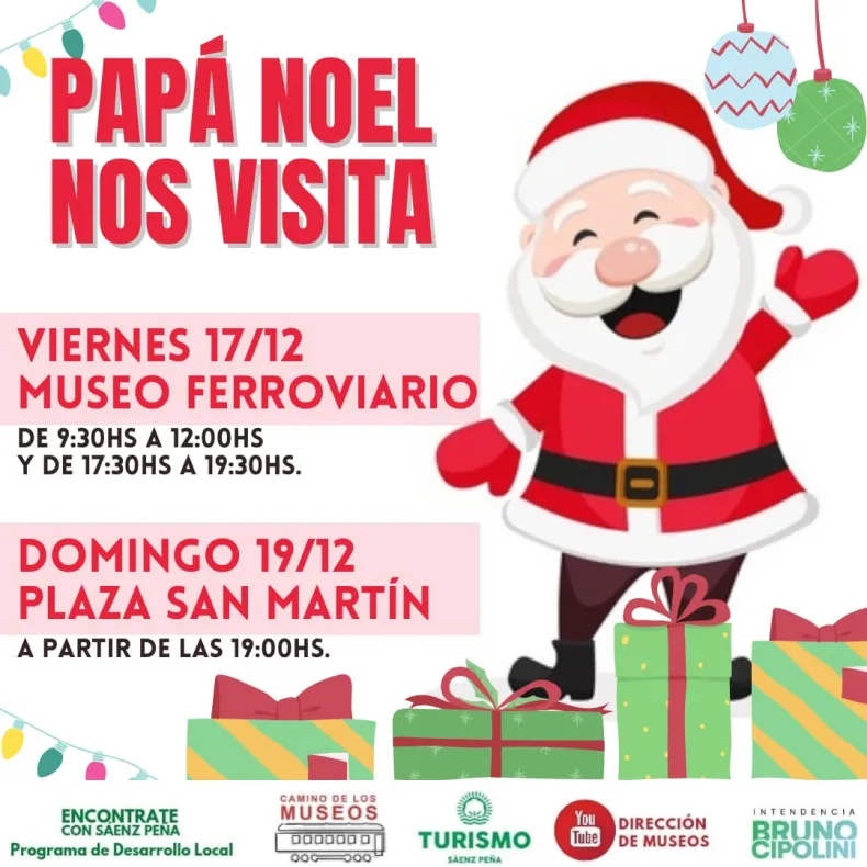 Como todos los años, este 2021 Papá Noel visitará Sáenz Peña para que los niños puedan dejarle su cartita y expresar sus deseos para las fiestas.El viernes 17 estará dejando regalos en el Museo Ferroviario, de 9:30 a 12 y de 17:30 a 19:30 horas, mientras que el domingo 19 estará en la plaza San Martín a partir de las 19 horas.