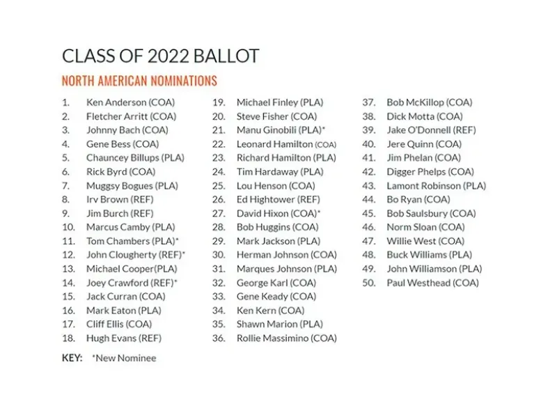 Los seleccionados que finalmente serán inducidos se conocerán durante el Final Four de la NCAA, las semifinales y la final del campeonato universitario de Estados Unidos, que se celebrará en abril en Nueva Orleans. La ceremonia de ingreso de 2022 está prevista del 9 al 10 de setiembre en el Salón de la Fama en Springfield, Massachusetts.