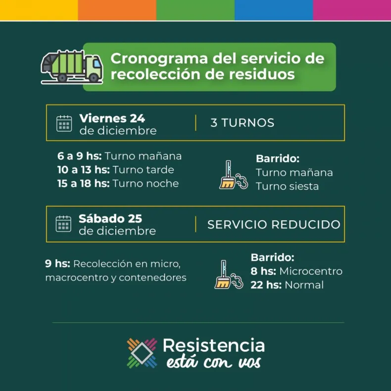 El Municipio de Resistencia informa a los vecinos de la ciudad los horarios en que se prestarán los servicios de recolección de residuos domiciliarios y de barrido en los días de Nochebuena, Navidad, Nochevieja y Año Nuevo.