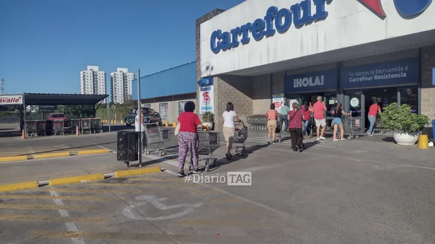 Desde minutos antes de su apertura, en una cadena de supermercados se vio una gran fila de personas que ingresó rápidamente cuando el reloj marcaba las 7.58.