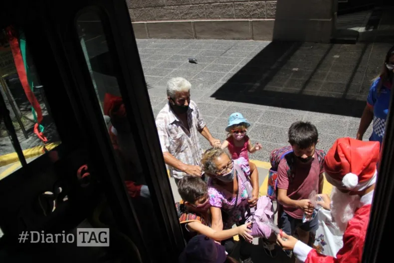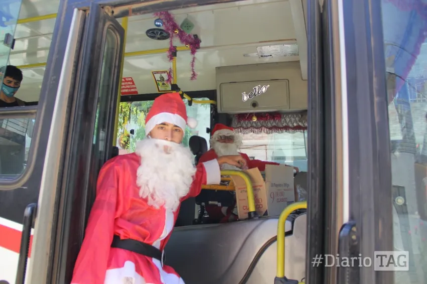 Papá Noel, conocido en la intimidad como Alcides Suarez y su acompañante Alejandro, fueron los encargados de soportar el calor de la ciudad con su traje navideño para brindarle un cordial saludo y sonrisas a cada uno de los pasajeros.