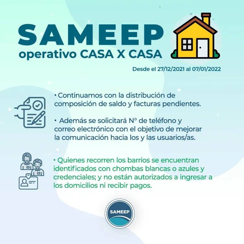 Es importante señalar que el personal no puede ingresar a los domicilios, ni aceptar dinero o pago alguno por facturas o gestión. Se encuentran uniformados de buzos/chombas blancas o azules e identificados con una credencial con código QR otorgada por Sameep.