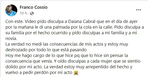 "Espero que puedan entender, a pesar de las críticas que reciba estaré siendo fuerte para salir adelante porque es una cosa que me tocó vivir el otro día y que mis padres me enseñaron mucha educación, mucho respeto y yo en ese momento no lo puse en práctica. Espero que me disculpen las personas que lastimé, que herí el sentimiento de cada uno y espero que me perdone la chica Daiana esta con la que pasó el hecho. Desde el fondo de mi corazón pido muchas disculpas, espero cambiar y que no se vuelva a repetir ningún caso así", cerró el joven.