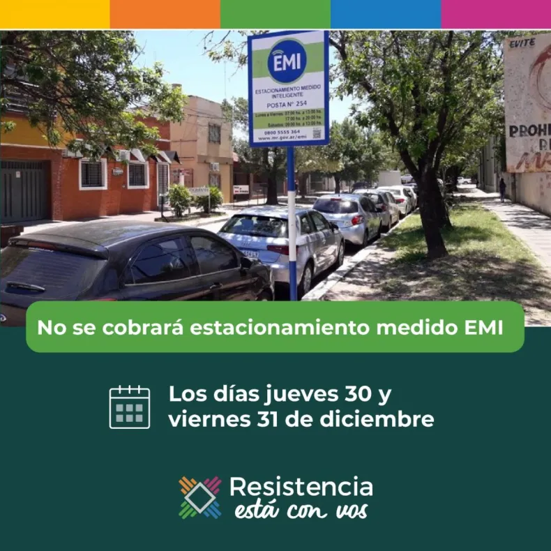 Entre el jueves 30 y viernes 31 de diciembre, el Municipio de Resistencia no cobrará el estacionamiento medido "a modo de brindar mayor comodidad a los conductores de vehículos y, a la vez, fomentar la actividad comercial".