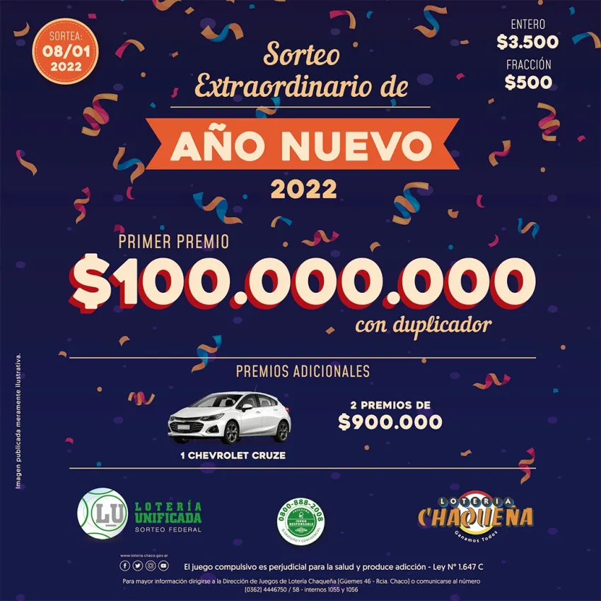 El Sorteo Extraordinario de Año Nuevo pondrá en juego un impactante primer premio de 100 millones de pesos con duplicador, así como dos premios de 900 mil pesos cada uno y un automóvil Chevrolet Cruze 0Km como sorteos adicionales por la compra del entero.