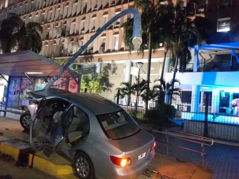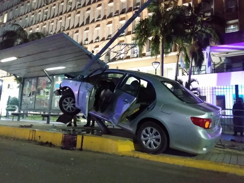 Un insólito accidente de tránsito se produjo esta madrugada y terminó dejando una impactante postal. Es que cerca de las 4 de la mañana, un auto Toyota Corolla con cuatro ocupantes terminó incrustado en la parada de colectivos de calle Mitre frente a Casa de Gobierno.