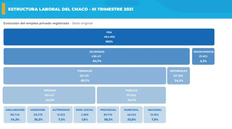 También expusieron que el sector privado tiene 163.413 empleos, 54, 3%; el sector público 167.602, 45,7 %. En ese porcentaje se incluye todo el sector público nacional, provincial y nacional, incluso docentes.