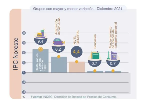 De esta manera y en lo que respecta al mes de diciembre, los productos-categoría que más sufrieron aumento fueron los siguientes: Restaurantes y hoteles 9,3%, Bebidas alcohólicas y tabaco 6,1%, Alimento y bebidas no alcohólicas 5,8%, Prendas de vestir y calzado 5,3%.