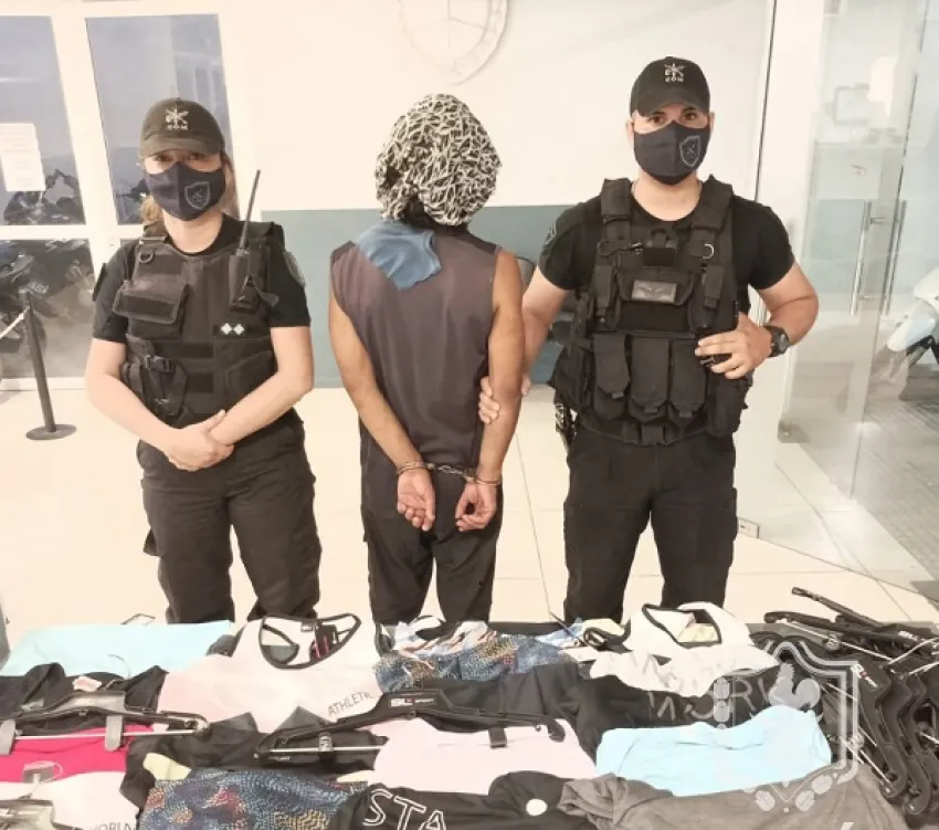 El delincuente fue abordado por los uniformados y al no poder justificar la cantidad de ropa que transportaba, intentó darse a la fuga siendo reducido a los pocos metros. La Policía decomisó 5 remeras, 5 musculosas, 4 tops, 1 calza larga, 2 calzas cortas y 16 perchas.