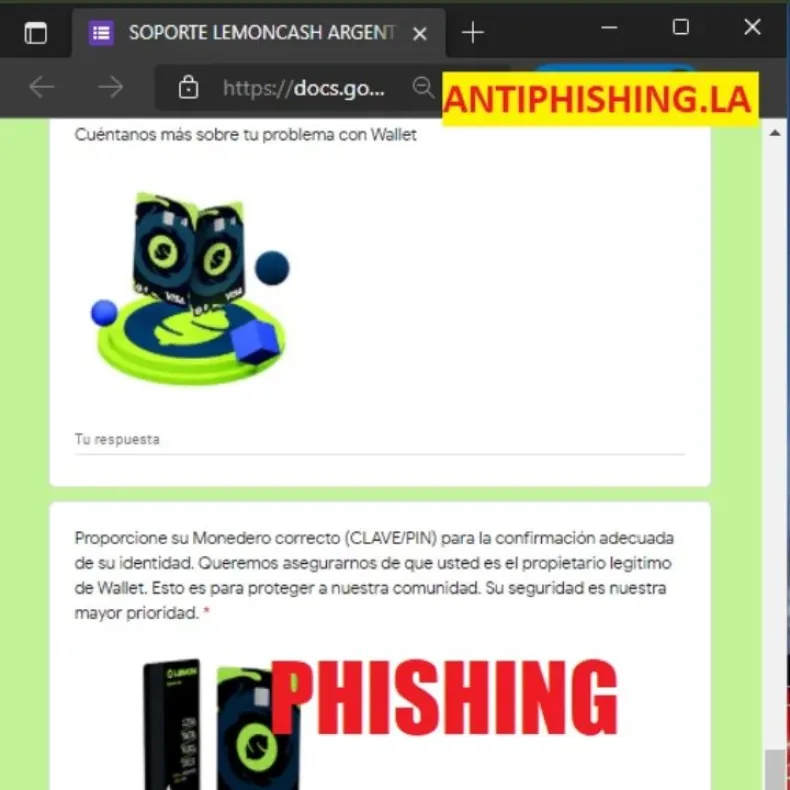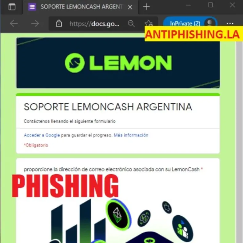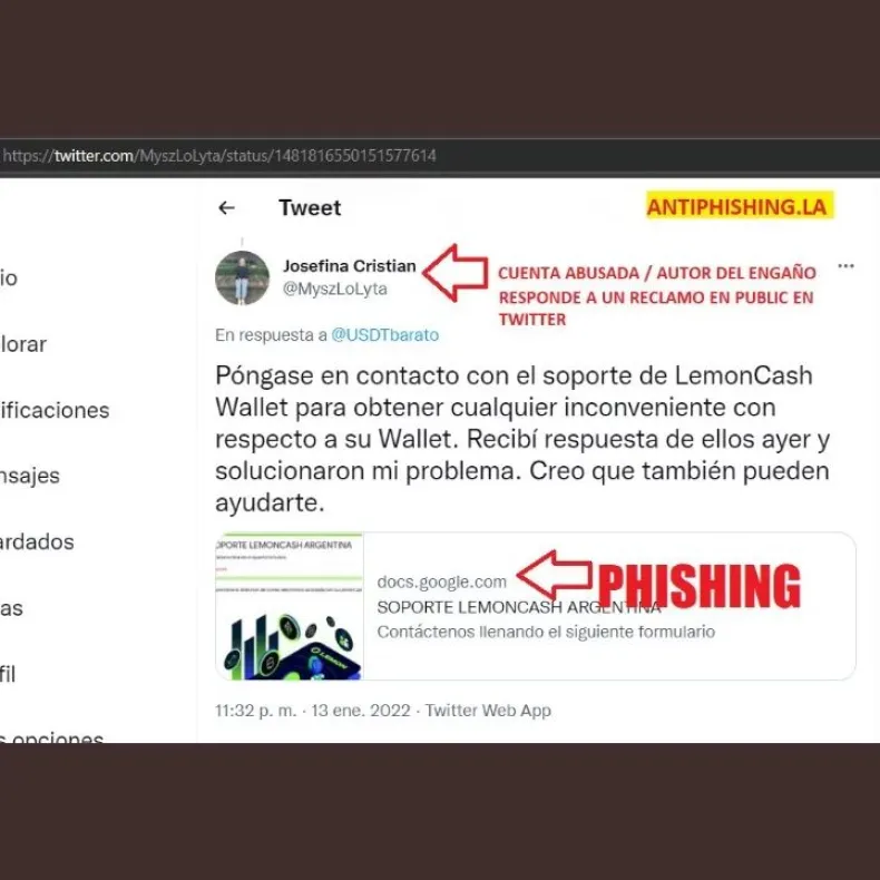 En este caso, una cuenta de Twitter, que previamente fue arrebatada, contesta un tuit de un cliente de Lemon Cash que tenía problemas con la billetera virtual del sistema. En su respuesta se adjunta un formulario de Google donde el afectado debe poner sus datos, y así se completa la usurpación de identidad.