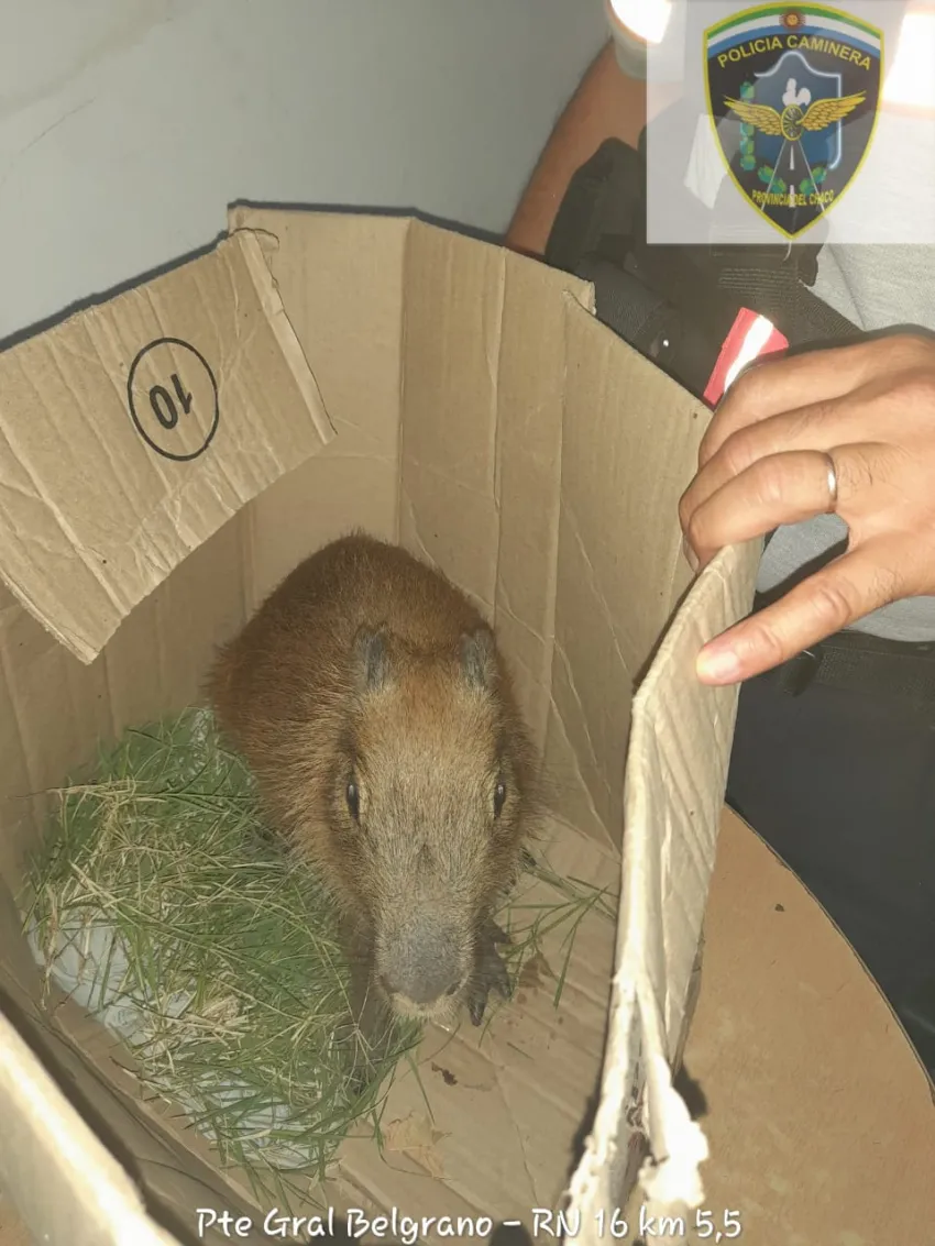 Esta medianoche, alrededor de las 0.30 horas, efectivos policiales rescataron a un ejemplar de capibara (carpincho) que era trasladado en una trafic. El hallazgo ocurrió durante un operativo en el puesto de control Puente General Belgrano.