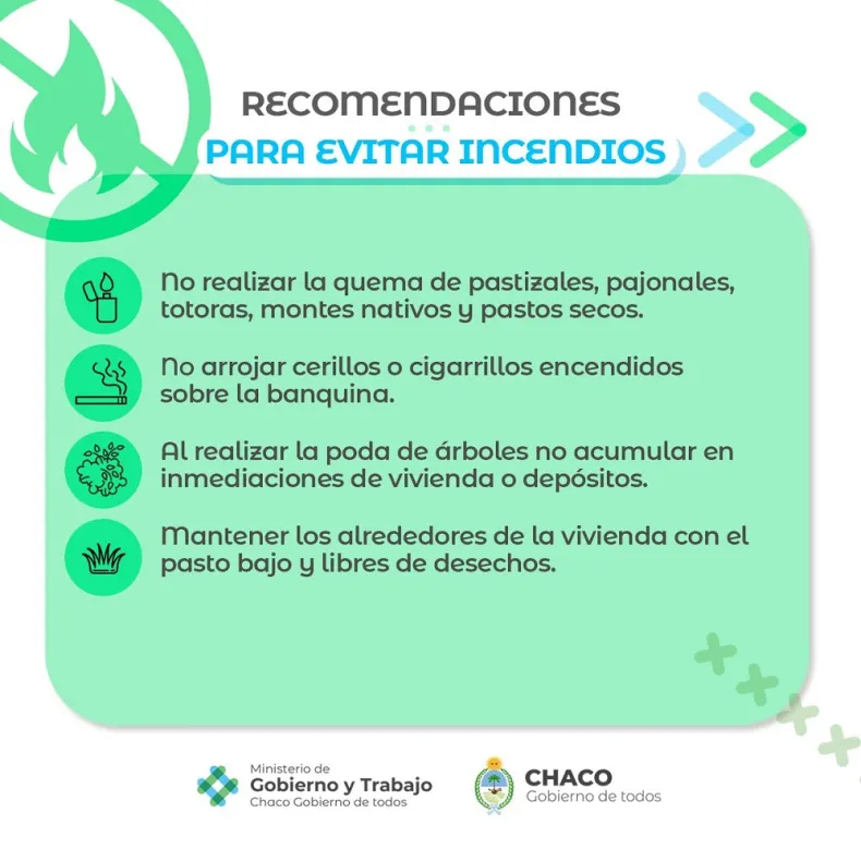 Sandoval instó a las chaqueñas y los chaqueños a prevenir cualquier tipo de incendios y no realizar quemas ni prender fuego. "En este momento, en todo el territorio provincial, las altas temperaturas debido a la ola de calor y la falta de lluvias generan muchísimo pasto seco que se transforma en un combustible ideal para propagar cualquier incendio que se inicie, si le sumamos que la meteorología no nos está ayudando, necesitamos que cada vecina y vecino tome conciencia de la situación y no encienda fuegos", sostuvo.