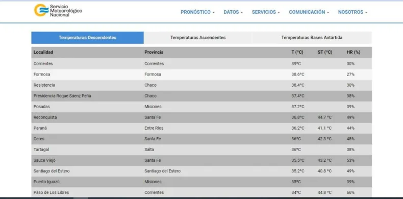 En este sentido las ciudades que se encuentran en primer y segundo lugar son Corrientes con un promedio de 39ºC y Formosa con 38.6ºC.