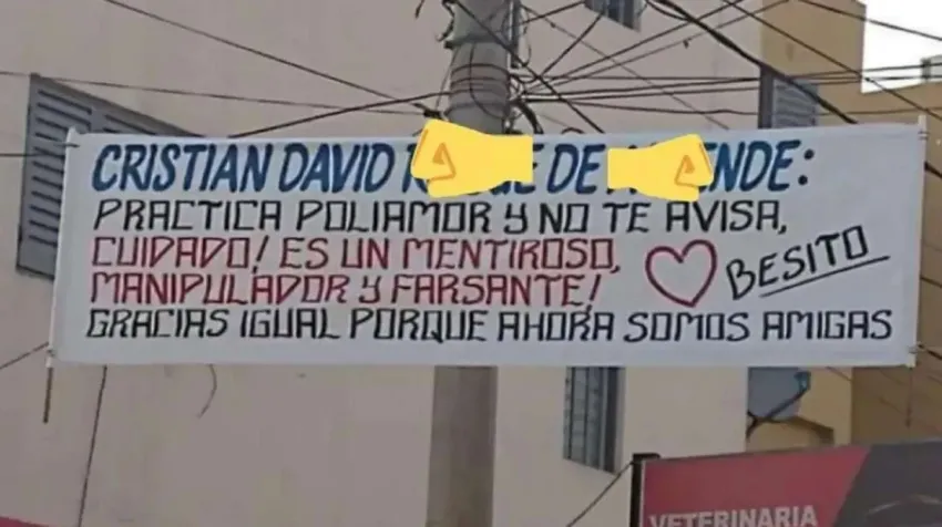 "Practica poliamor y no te avisa, cuidado. Cuidado, es un mentiroso, manipulador y farsante", dice una parte del pasacalle colgado en el barrio Ampliación San Fernando, ubicado al sur de la capital cordobesa.
