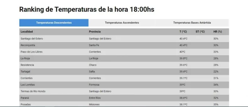 En este sentido las ciudades que se encuentran entre las primeras cinco son las localidades de Santiago del Estero con 40.4ºC, Reconquista con 40.4ºC, Paso de Los Libres con 40ºC y La Rioja 39.8ºC.