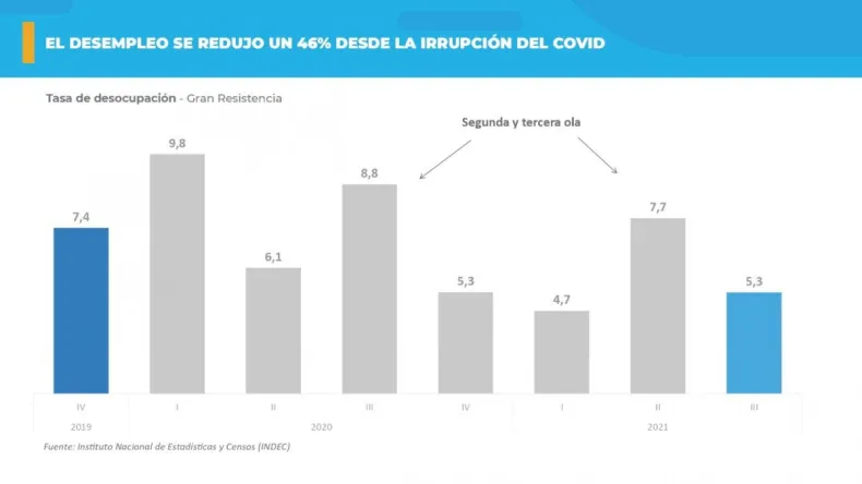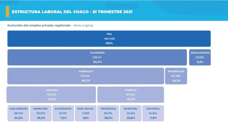 Actualmente y según los últimos datos provinciales, la estructura de empleo del Chaco está representada por 485.000 chaqueños que tienen o buscan trabajo. De ese total, 301.000 personas cuentan con empleos formales, y otras 153.000 trabajan de manera informal, mientras que existe un aproximado de 25.000 personas desocupadas. Esta tasa de desempleo tuvo una abrupta reducción en el primer trimestre del 2020 que se amesetó en 5,3%. Sin embargo, cada hogar chaqueño posee por lo menos un ingreso formal, informal o de transferencias sociales directas.