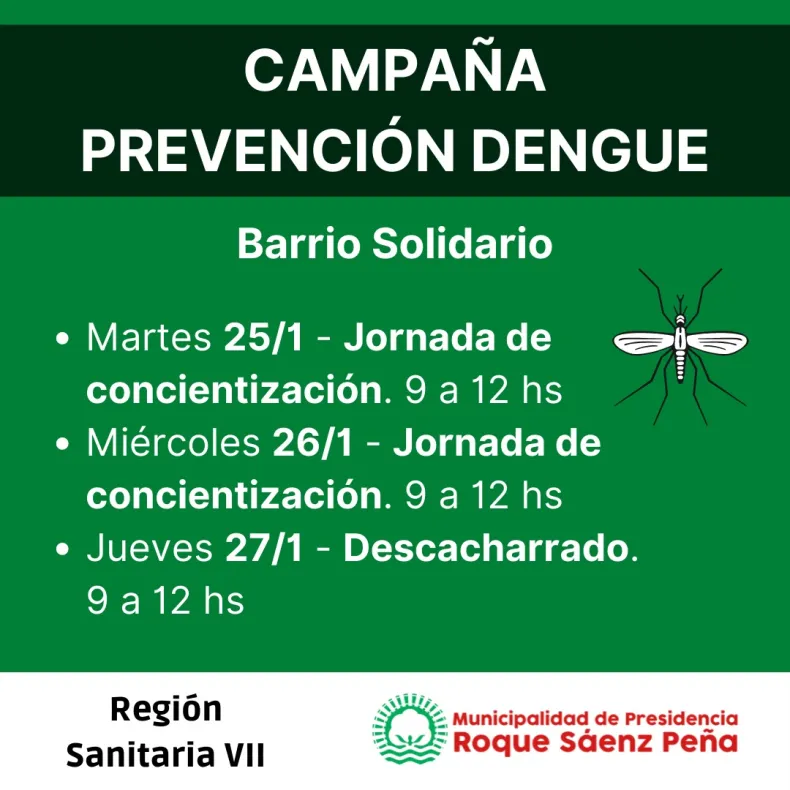La actividad comenzará el próximo martes 25 de enero con la metodología de trabajo casa por casa concientizando a los vecinos. En tanto que el miércoles 26 se repetirá la metodología y el jueves 27 se realizará el descacharrado.