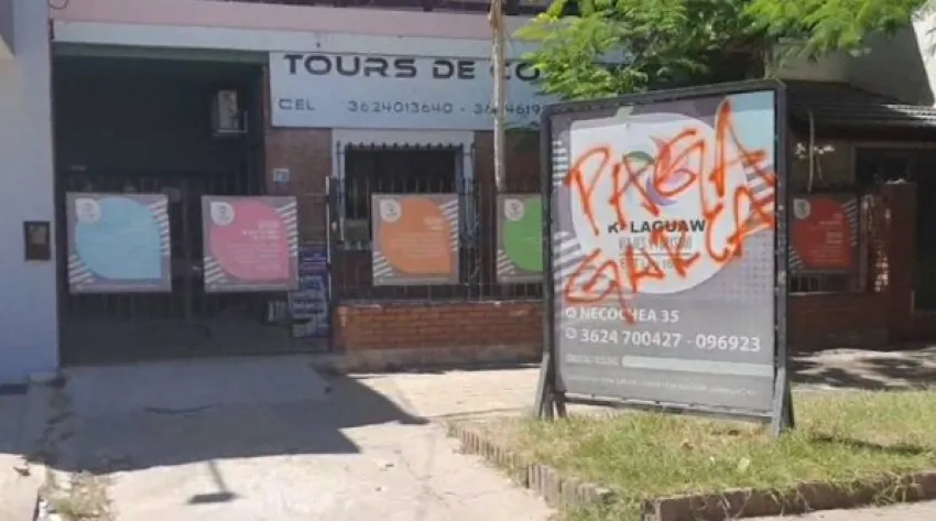 En uno de los carteles de la agencia de viajes se pudo ver una pintada con aerosol que decía "Paga garca", y es que las personas reunidas reclamaban que el dueño de la empresa les había estafado dinero.