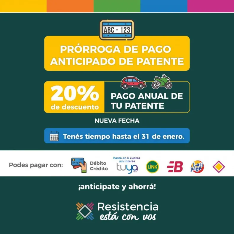 El Municipio de Resistencia recordó a los y las contribuyentes que se prorrogó, hasta el 31 de enero, el plazo para el pago anual anticipado del impuesto de patente, con descuentos de hasta un 20% para el buen contribuyente y pago voluntario.