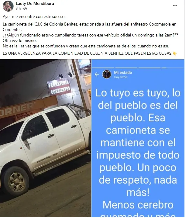 En la filmación que realizó un vecino y que rápidamente se hizo viral en redes sociales, se ve la camioneta oficial estacionado y al joven comentando: "Buenas noches gente de Colonia Benítez, pueblo donde estamos hace 10 días sin agua, hay bajones de luz todos los días, estamos con cortes de energía y acá nos encontramos en Corrientes la camioneta del CIC".