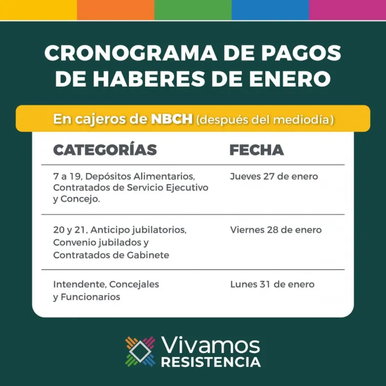El municipio de Resistencia anunció que este jueves 27 de enero comenzará el pago de haberes correspondientes al mes de enero para los trabajadores municipales. Los sueldos estarán disponibles después del mediodía en todos los cajeros del Nuevo Banco del Chaco.