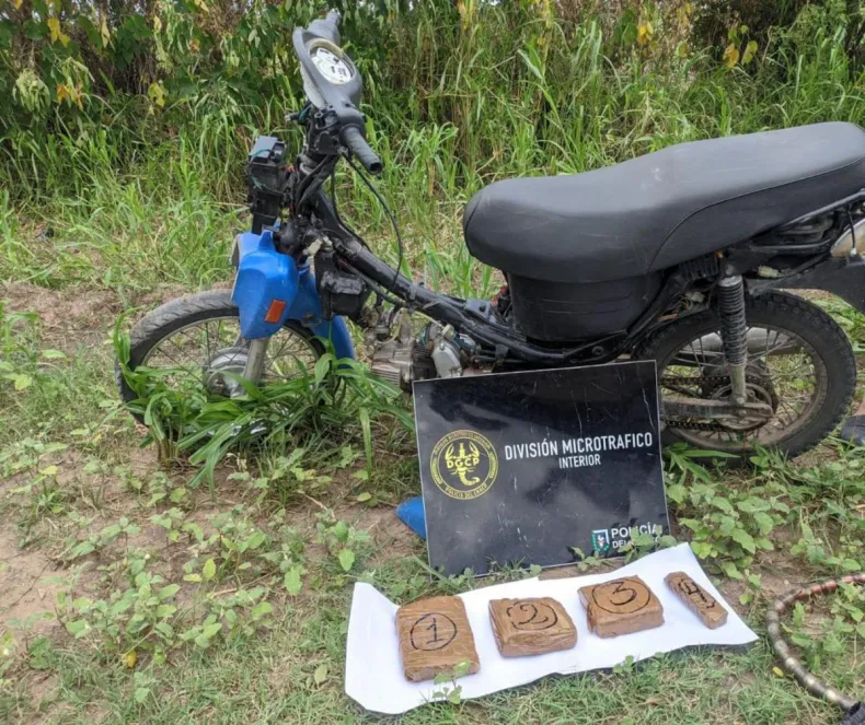 Luego de un recorrido largo, el joven cayó del rodado e intentó huir a pie siendo atrapado por los efectivos policiales en un camino vecinal.Al inspeccionar el contenido del bolso encontraron 4 paquetes con forma rectangular, tipo ladrillo, conteniendo una sustancia que terminaría siendo Marihuana, arrojando un pesaje de 1 kilo 630 gramos.