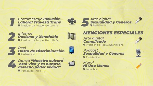 El primer lugar fue para el cortometraje llamado, "Inclusión Laboral Travesti Trans", de Presidencia Roque Sáenz Peña; el segundo para el informe "Racismo y Xenofobia", también de Sáenz Peña, el tercero para el video reel "Basta de Discriminación", de Resistencia; el 4º para una obra de danza llamada "Nuestra cultura está viva y es nuestro derecho poder vivirla", protagonizada por jóvenes de Pampa del Indio, y el 5º para un proyecto de arte digital "Sexualidad y Géneros", de Resistencia.