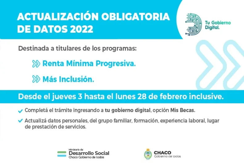 El Ministerio de Desarrollo Social informa que las personas que forman parte de los programas Renta Mínima Progresiva y Más inclusión, deberán actualizar sus datos a través de la web gobiernodigital.chaco.gob.ar, utilizando usuario y contraseña, o creando una cuenta si aún no están registrados. La convocatoria es obligatoria.