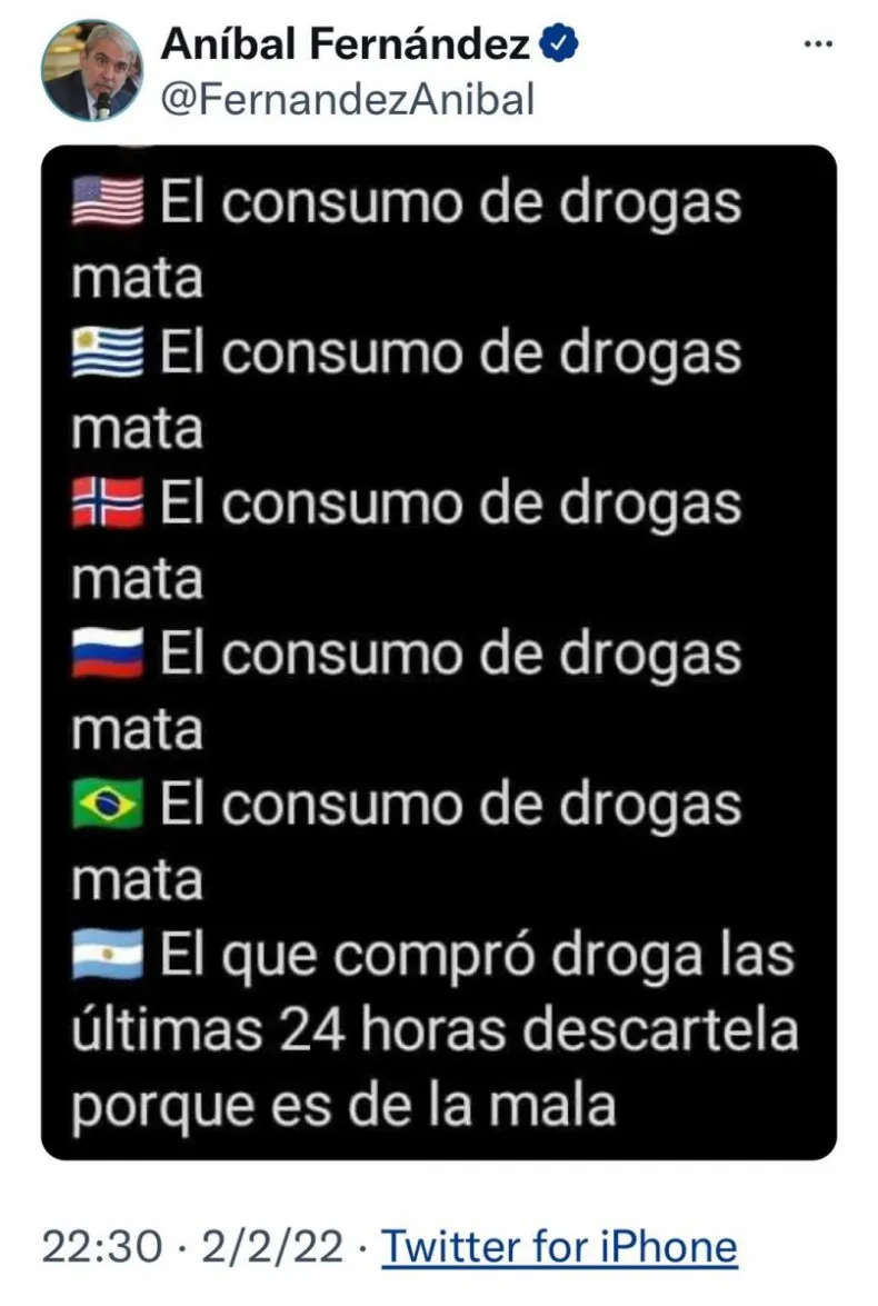 Fernández publicó un meme en el que se muestran banderas de distintos países junto a la leyenda: "El consumo de drogas mata". Al final de la lista aparece la bandera argentina, pero con una frase diferente: "El que compró droga las últimas 24 horas descártela porque es de la mala", haciendo clara referencia a los dichos de Berni, que horas antes había declarado: "Quienes compraron droga en estas últimas 24 horas tienen que descartarla".
