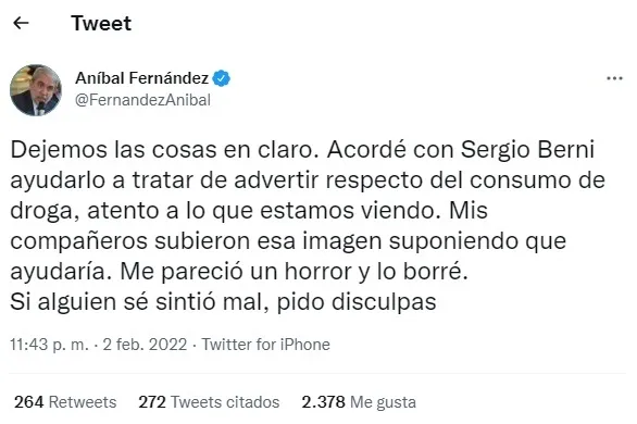 "Dejemos las cosas en claro. Acordé con Sergio Berni ayudarlo a tratar de advertir respecto del consumo de droga, atento a lo que estamos viendo. Mis compañeros subieron esa imagen suponiendo que ayudaría. Me pareció un horror y lo borré. Si alguien se sintió mal, pido disculpas", expresó el ministro de Seguridad de la Nación en su cuenta oficial de Twitter.