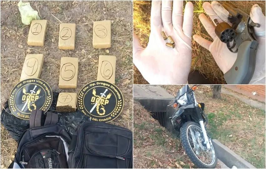 Al inspeccionar la mochila se encontraron 7 ladrillos de marihuana, con un peso de 7, 784 kilos. Se secuestraron los estupefacientes, el arma calibre 22 y las motocicletas Yamaha XTZ color negra y Corven Energy 110cc., color negro.