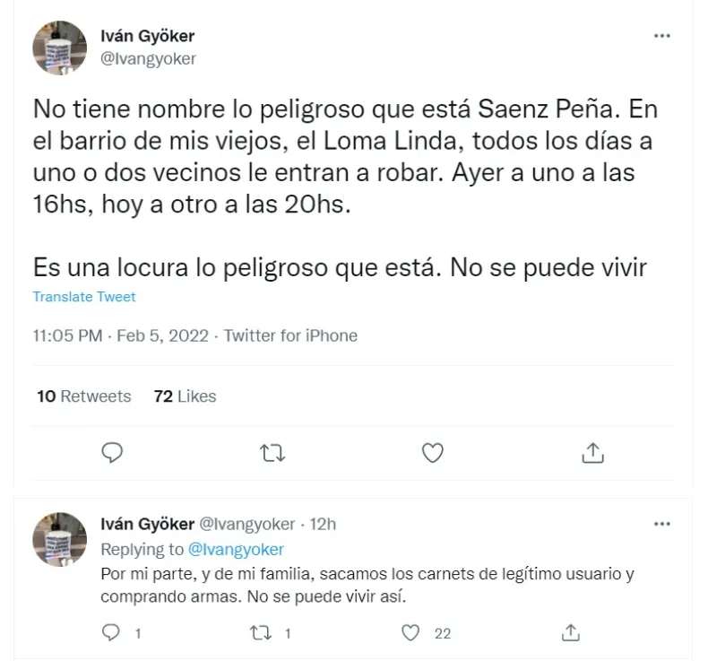 "Es una situación demasiado desgastante y da miedo. No sabes cuándo un tipo armado puede entrarte a tu casa, si a todos les viene pasando. Nos hartamos y si bien nunca quisimos tener armas decidimos hacernos los carnets y tramitarlas porque no se puede vivir así. No podés poner cara de bueno y rogar que no te maten o hagan lo que se les ocurra a los delincuentes. Nos hartamos. Es un garrón porque nunca fue la idea pero no se puede vivir así", cerró al respecto.